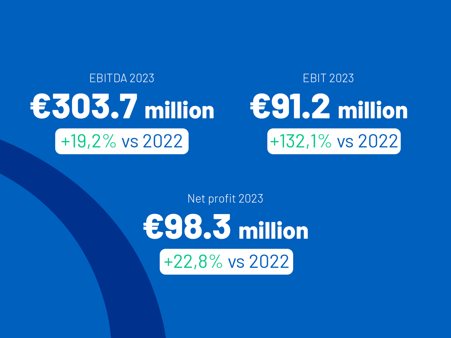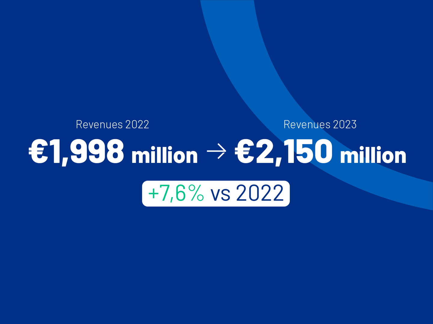 Revenues stand at 2.1 billion euros, marking a new record for the Group, with a +7.6% increase cutting across all business segments compared to 2022. Even more significant is the increase in the margins, which have already improved notably on the previous year.