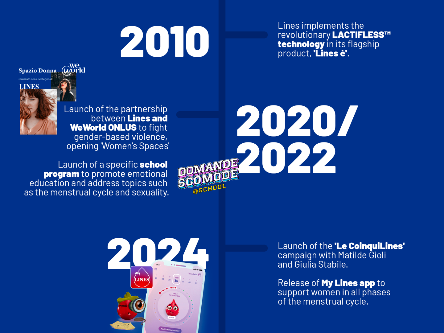 Innovation and initiative: these are the values that best represent Lines and have guided its growth, from 1963 to today. A pioneer not only in product innovation but also in creating new communication approaches against stereotypes and gender discrimination, Lines has believed and acted concretely for over 60 years in building a world where women can feel free to be themselves.
