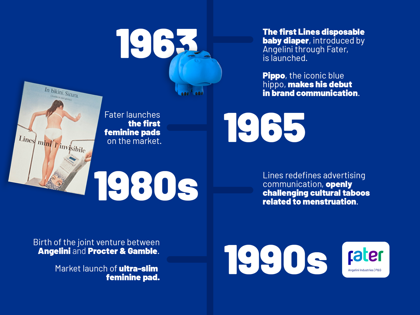 Lines was born at the height of the population boom when Angelini, through the Fater company, discovered the existence of innovative disposable baby diapers in northern Europe. From the first small-scale production, this led in 1963 to the launch of the product on the market under the Lines brand (Lines, like the linen used to make the bands that wrapped around newborns). Thanks to an original and impactful communication starring PIPPO, the iconic blue hippo, Lines entered the hearts of Italian families: first with the Carousel and then with commercials, the character narrated with charm and humour, innovative products that made babies always "drier and happier" and mothers always freer from chores. And it was precisely for women that Fater, exploiting the know-how gained from the materials and production techniques of baby diapers, developed the first feminine pads in 1965. A new chapter of innovation continued and strengthened in the 1990s with the birth of a Joint Venture between Angelini and Procter & Gamble, leading Fater to introduce ultra-thin sanitary pads to the market, along with other significant innovations over time. In 2010, the revolutionary LACTIFLESS™ technology was introduced in the top-tier product, Lines è, allowing the pad to perfectly adapt to the body.