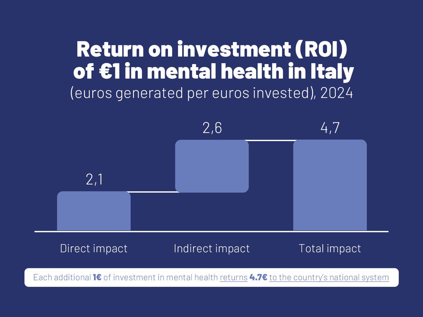 Currently, Italy allocates 3.4 percent of national health spending to mental health. An increase to 5 percent, in line with the EU average, would result in economic benefits of 10.4 billion euros, from reduced direct health, welfare and social spending and improved productivity. Headway's Italian Report estimates that every euro invested in mental health produces a return of 4.7 euros for the national economy.