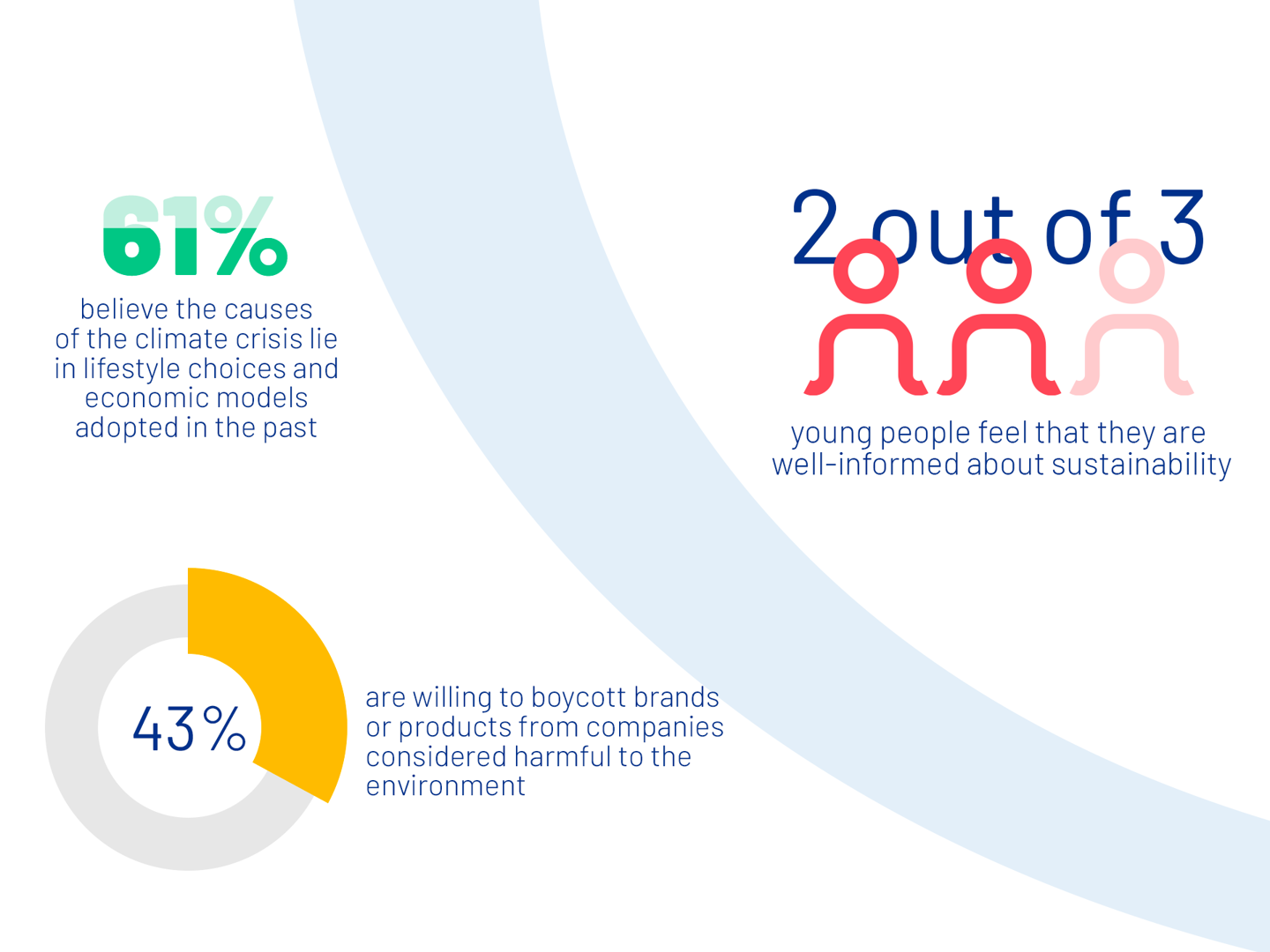 Many young people hold previous generations responsible for the planet's crisis, but they are ready to turn resentment into action and accountability: 61% attribute the origin of the climate crisis to the lifestyle and economic models adopted in the past, 2 in 3 say they are adequately informed about sustainability, while 43% are willing to boycott products and services of companies deemed harmful to the environment.