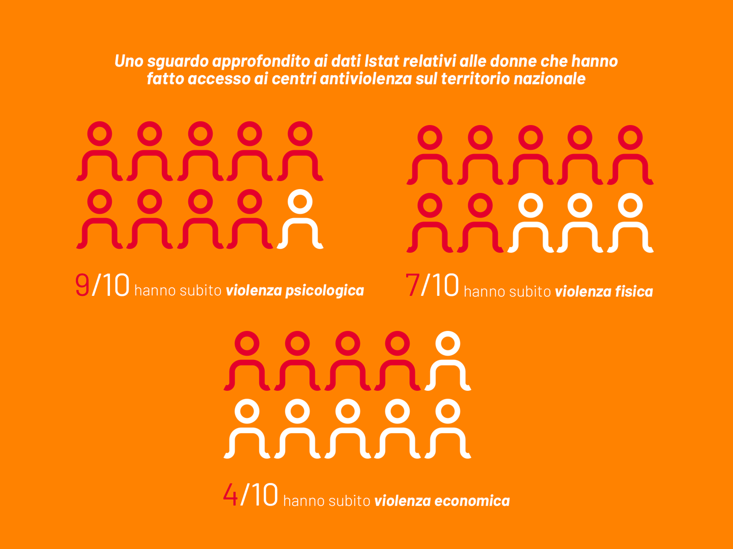 E stando ai più recenti dati Istat, sul totale delle donne che hanno fatto accesso a tutti i centri antiviolenza sul territorio nazionale, 9 su 10 hanno subito violenza psicologica, 7 su 10 violenza fisica, 4 su 10 violenza economica.