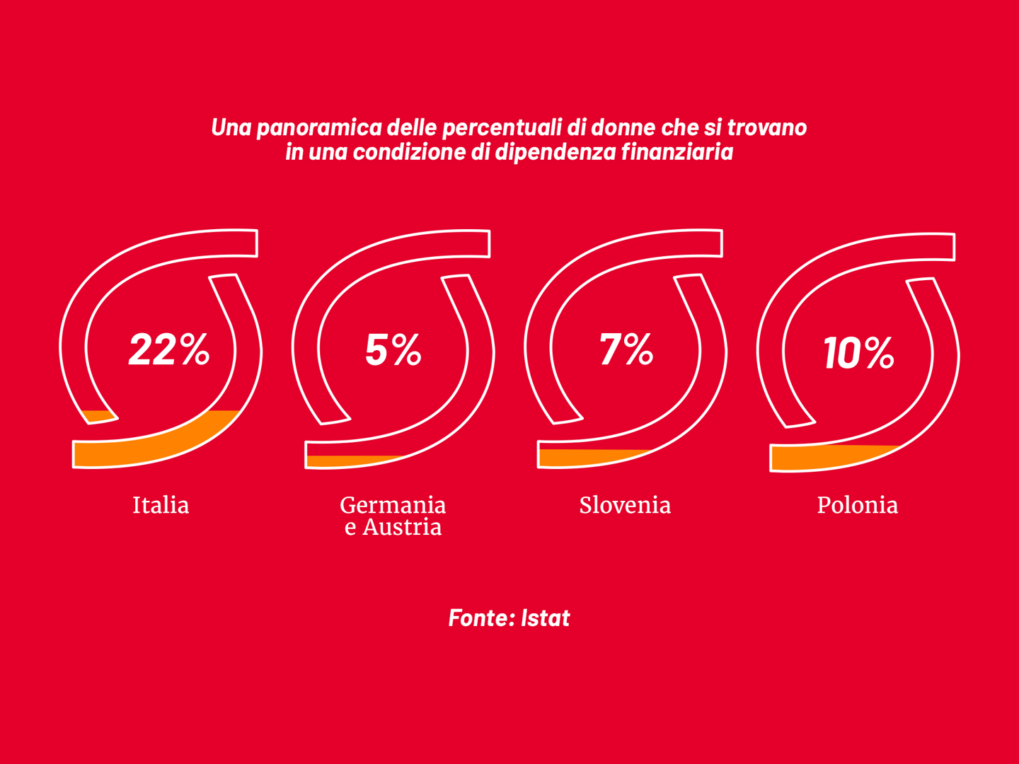 Più di una donna su cinque. Quasi una su quattro. Un dato isolato, quello italiano: in Germania ed Austria, le donne in condizione di dipendenza economica rappresentano solo il 5% del totale, in Slovenia il 7%, in Polonia il 10%.