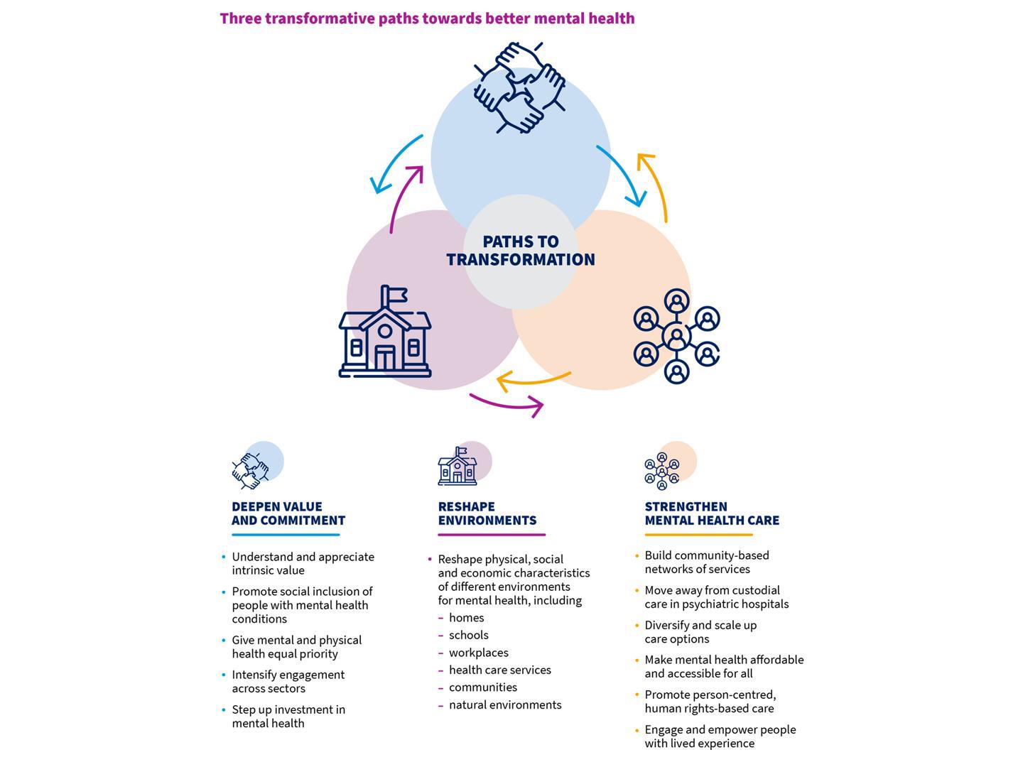 La maggior parte delle persone rinuncia a chiedere aiuto quando si tratta di salute mentale per via dello stigma e della discriminazione, dei costi, della qualità dei servizi, della mancanza di informazione e delle modalità di cura offerte dai centri psichiatrici. Il report World mental health report: Transforming mental health for all dell’OMS individua tre piani d’azione per affrontare il problema.