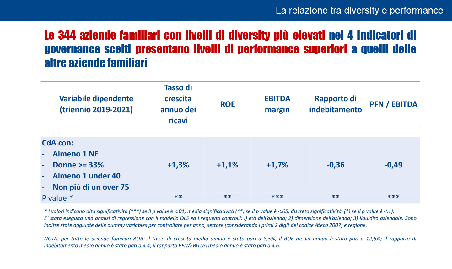 Tra i dati più significativi, emerge che la struttura e i modelli di governance delle imprese familiari abbiano consentito loro di rispondere con efficacia alle difficoltà economiche causate dalle sfide degli ultimi anni. Il successo delle imprese familiari oltre a essere definito dai profitti infatti, nasce anche da obiettivi non strettamente finanziari: il controllo, la successione transgenerazionale, il capitale sociale e umano, il legame affettivo con l’azienda e la sua reputazione. Questo spiega perché, superato il primo impatto con l’emergenza, questo genere di imprese abbia unito i propri sforzi per attuare strategie a lungo termine, proteggere il purpose e il valore socio-emotivo che la famiglia trae dal possesso dell’attività aziendale. I dati dell'Osservatorio AUB rivelano, infatti, come la solidità media di tutte le aziende familiari italiane è migliorata di oltre il 20% rispetto al 2019: il rapporto di indebitamento (totale attivo/patrimonio netto) è sceso da 5 a 4 volte. È emerso, inoltre, che questo genere di imprese crei una maggiore occupazione, cresca più rapidamente rispetto alle altre e abbia debiti minori.