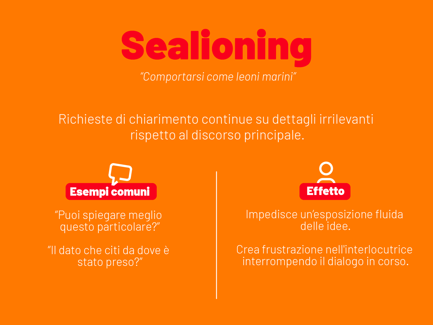 - Il primo comportamento che vorrei trattare è chiamato in inglese sealioning, cioè “comportarsi come leoni marini”. Questi animali sono notoriamente piuttosto ingombranti e poco agili nel muoversi; il sealioning, per analogia, consiste nel tempestare una persona di domande, di richieste di chiarimento, su questioni che esulano dal filo del discorso: “Ma qui cosa intendevi dire?”, “Puoi spiegare meglio questo particolare?”, “Il dato che citi da dove è stato preso?”, “Mi puoi chiarire in che maniera hai usato il termine xy?”, “Hai letto le osservazioni di zx sullo stesso tema? Potrebbero esserti utili…”. Lo scopo del sealioning è solo raramente quello di ricevere informazioni aggiuntive; piuttosto, è un modo per sovraccaricare la persona che sta cercando di portare avanti un determinato discorso in maniera coerente e coesa, costringendola a interrompersi continuamente e a deviare su questioni collaterali. Il motivo per cui questo è un comportamento aggressivo è abbastanza evidente: impedisce alla persona di esporre chiaramente, e in maniera indisturbata, le sue idee. Se uniamo queste informazioni al fatto che una donna, come già menzionato, vive più spesso l’esperienza di venire interrotta, si può comprendere come il sealioning venga più spesso rivolto a una persona di genere femminile che non a un uomo.