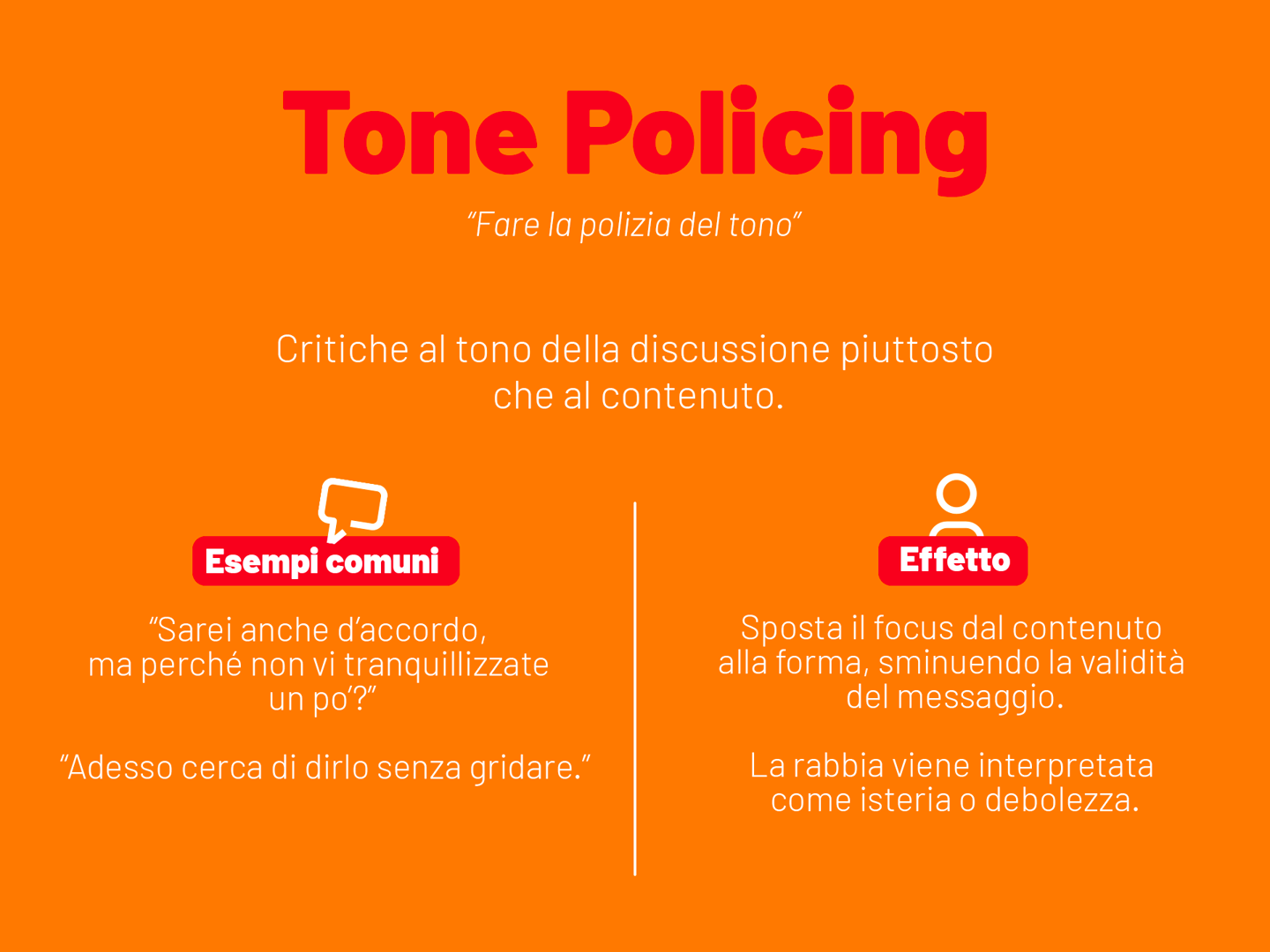 - Il secondo comportamento è il tone policing, da police, cioè “fare la polizia del tono”. “Le tue istanze sono sacrosante, ma se usi quel tono, non va bene”; “Adesso cerca di dirlo senza gridare”; “Sarei anche d’accordo, ma perché non vi tranquillizzate un po’?”.