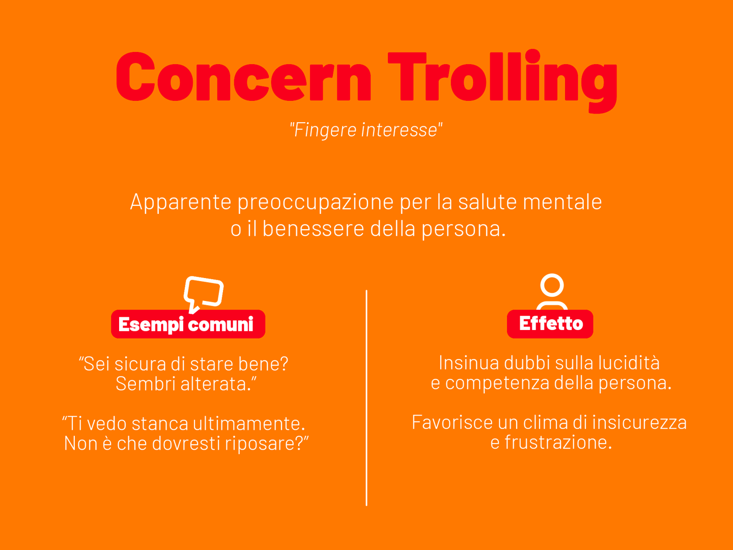 - Infine, l’ultimo comportamento è il concern trolling, la manifestazione di un’apparente preoccupazione rispetto alla salute mentale della persona con cui si sta parlando (“Sei sicura di stare bene? Sembri alterata…”; “Ti vedo stanca ultimamente. Non è che dovresti riposare?”). Sebbene a volte la preoccupazione sia giustificata, non va sottovalutata la fatica data dallo stillicidio di un simile atteggiamento; il sovraccarico mentale che causa, infatti, può portare a vere e proprie forme di disagio mentale per chi le subisce. In fondo, si tratta di mettere continuamente in dubbio la lucidità e la competenza di una persona, facendo baluginare l’idea che magari questa sia in uno stato di anormalità o di scarsa lucidità.