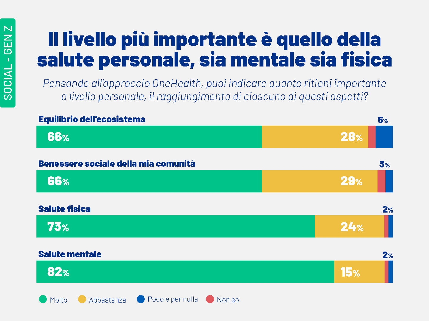 Una volta informati sul significato esatto dell’espressione, i giovani interpellati hanno individuato nella salute mentale il suo elemento più rilevante (81,5%), seguita da altri aspetti fondamentali della “salute complessiva” come la salute fisica (73%), il benessere sociale della comunità (66%) e l’equilibrio dell’ecosistema (66%).