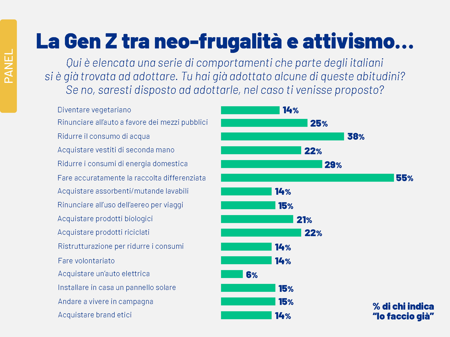 Questa convinzione si traduce in comportamenti concreti, che spaziano dalla neo-frugalità all’attivismo responsabile: il 55,3% dichiara di fare la raccolta differenziata in modo accurato (+3,4% rispetto al 2024), il 38% si impegna a ridurre il consumo di acqua (+7%), il 28,8% ha adottato misure drastiche per contenere i consumi energetici domestici (+7,8%), come rinunciare all’aria condizionata o mantenere una temperatura più bassa in inverno. Infine, il 24,5% (+8,3%) ha scelto di non usare più l’auto privata, preferendo mezzi pubblici o biciclette.