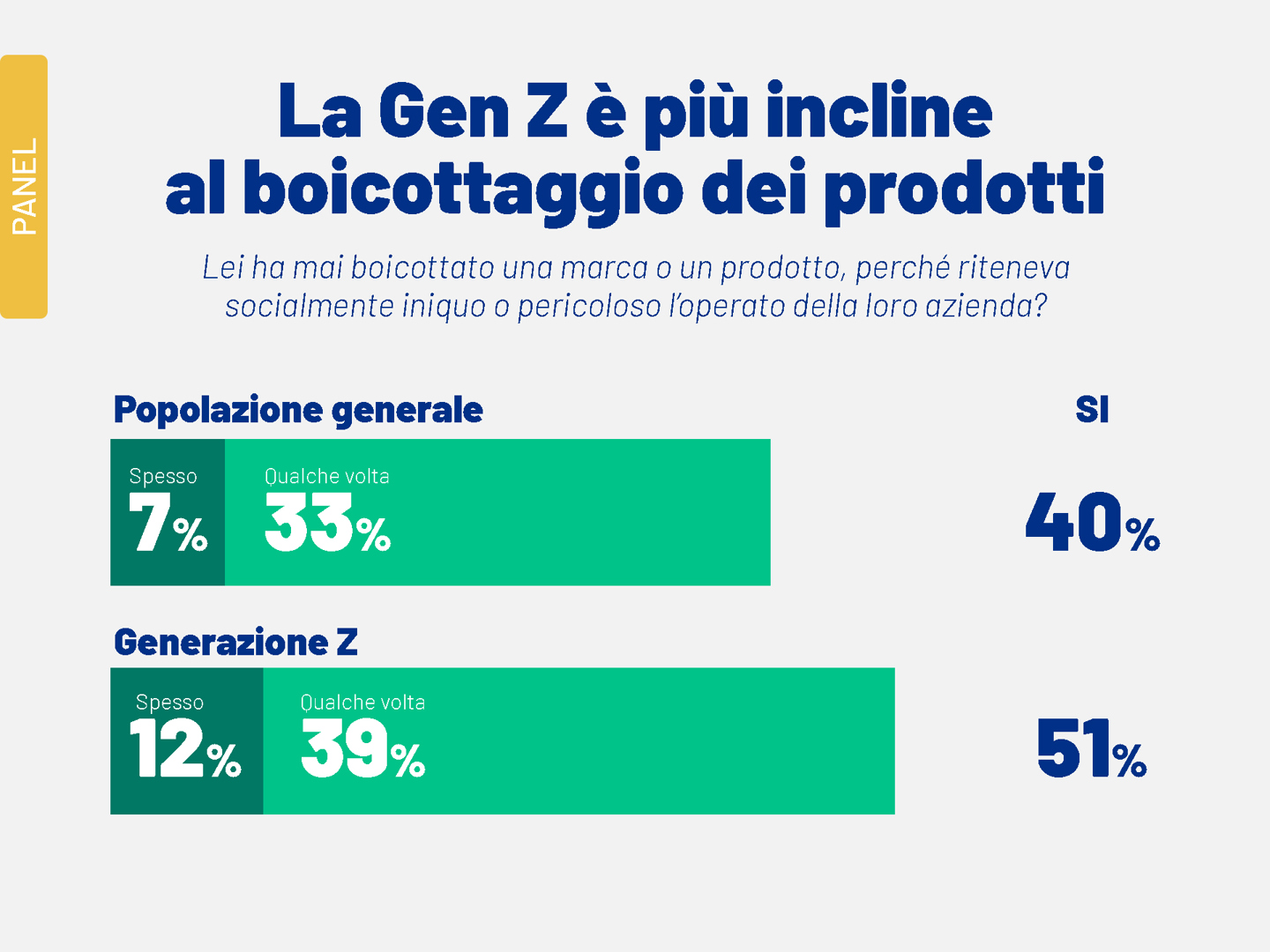 A conferma di questa crescente sensibilità etica, il 51% della nuova generazione dichiara di aver già boicottato almeno un’azienda ritenuta socialmente iniqua o pericolosa, contro il 40% registrato nel resto del campione.