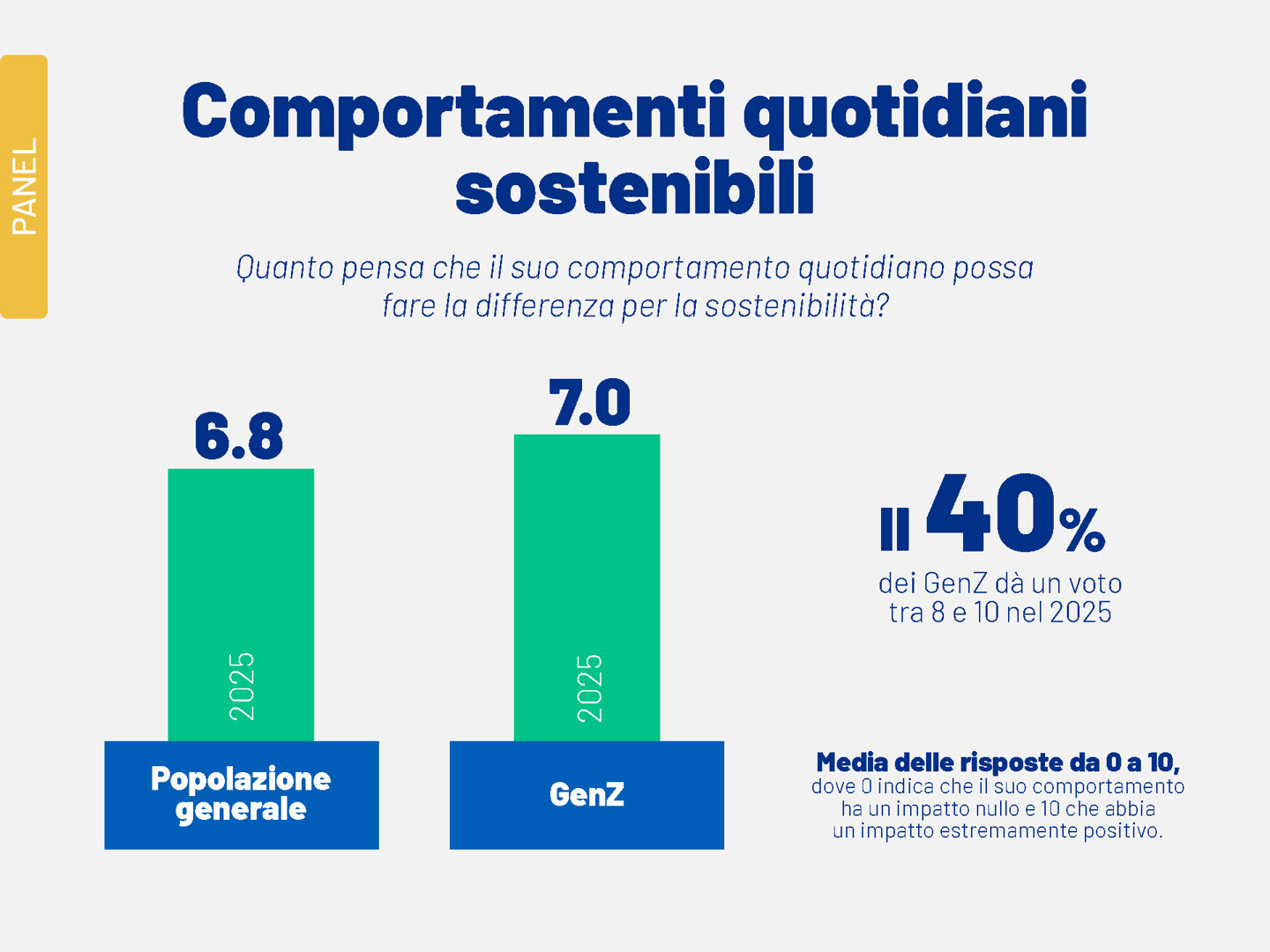 Nonostante rispetto al 2024 si sia registrato un aumento della percentuale della popolazione più giovane sfiduciata (45% contro il 34% dell’anno precedente), convinti che gli obiettivi legati alla sostenibilità non verranno raggiunti a causa di un degrado ambientale ormai irreversibile, la maggioranza della nuova generazione (55%) continua a credere che questi traguardi possano trasformare radicalmente il nostro stile di vita. In questo scenario, resta centrale il ruolo delle azioni individuali: l’82,2% dei componenti della Gen Z (contro il 79,3% del resto del campione) ritiene che il proprio contributo quotidiano possa fare la differenza.